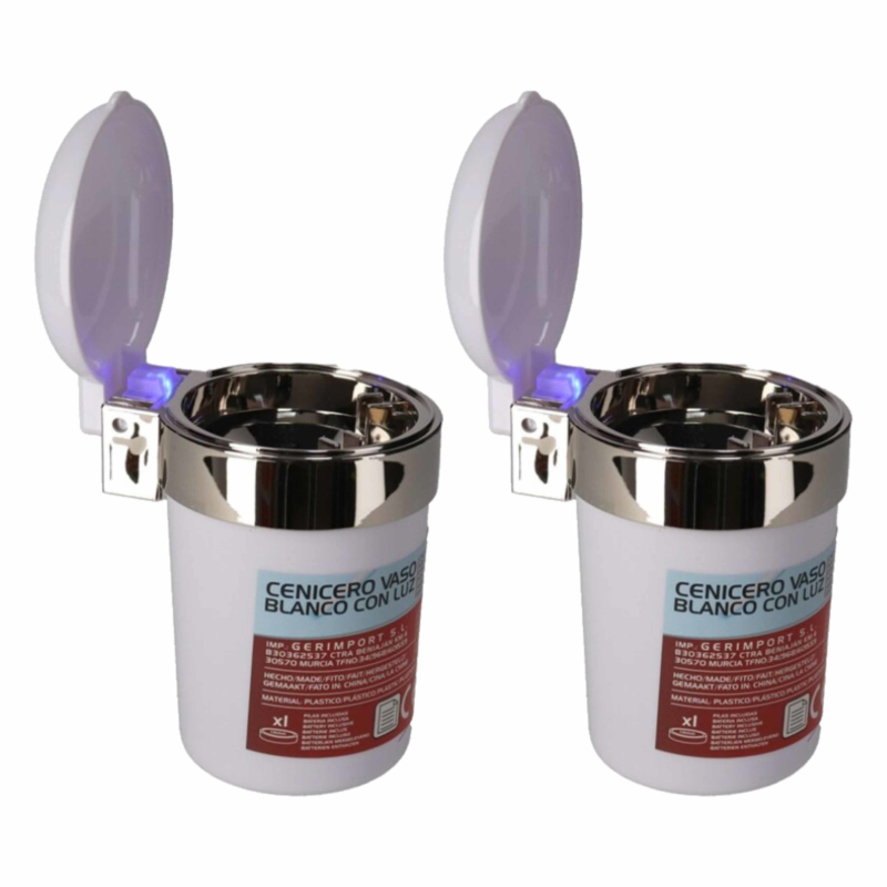 2x Auto asbak wit met Led verlichting en klepje 11 x 9 cm. Ideale asbak voor in de auto met Led verlichting, past in bijna elke bekerhouder. De asbak is hittebestendig en is makkelijk schoon te maken. Dankzij het klepje/de deksel blijft de as in de asbak en wordt de meeste asbaklucht tegengehouden. Bekerhouder formaat, ongeveer 11 x 9 cm. Incl. 2x Cr2032, knoopcelbatterij. Materiaal: kunststof. Anti rook geurvrije auto asbakken.